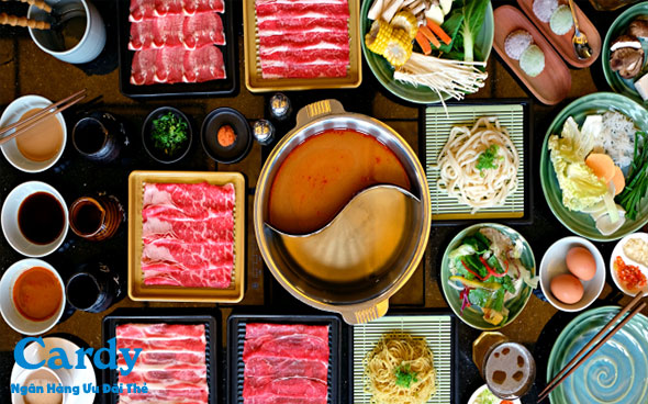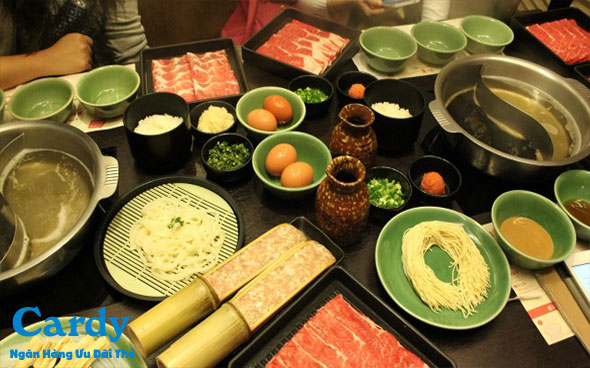 Giảm 50% trên menu buffet cơ bản giá 238.000đ, 338.000đ, 388.000đ. Mức ưu đãi trên 1 hóa đơn không quá 700.000đ ( chưa bao gồm thuế VAT). Chỉ áp dụng cho dòng thẻ tín dụng Titanium và Platinum. Áp dụng vào Thứ 5 và Thứ 6 hàng tuần