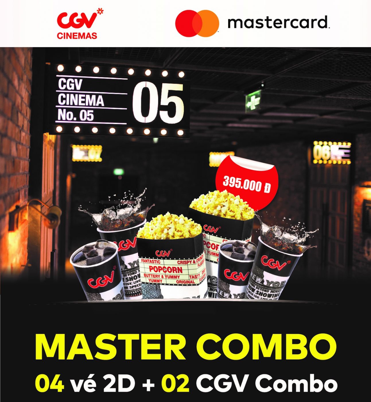 - Mua Master Combo (bao gồm 4 vé xem phim 2D và 2 CGV Combo) cho các suất chiếu 2D các ngày trong tuần (thứ hai, thứ ba, thứ tư và thứ năm) với giá VND395,000 khi thanh toán bằng thẻ Mastercard.